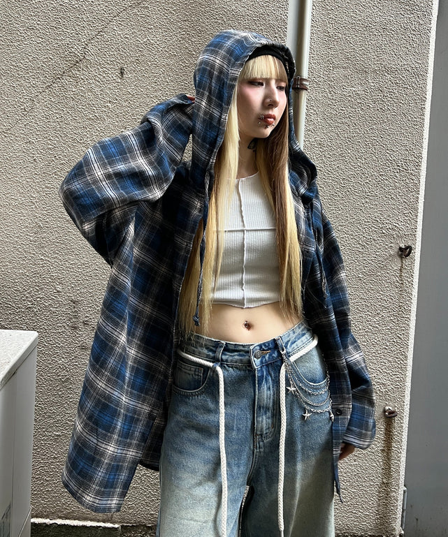 フーデッドオーバーチェックシャツ