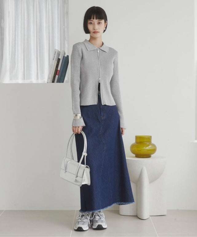 Aラインシルエットで、リメイク風の切り替えを入れたデニムのロングスカートが新登場!