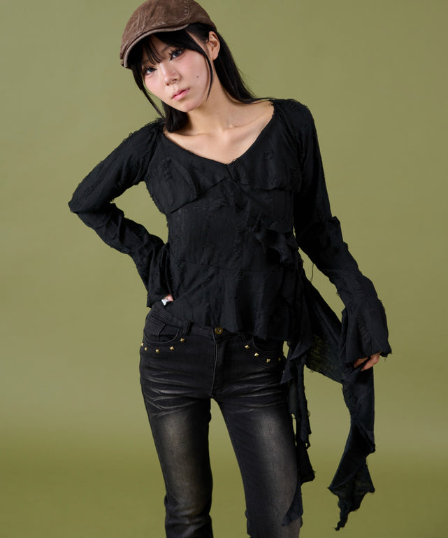大胆なサイドテールのフリルが視線を奪うデザイントップス。