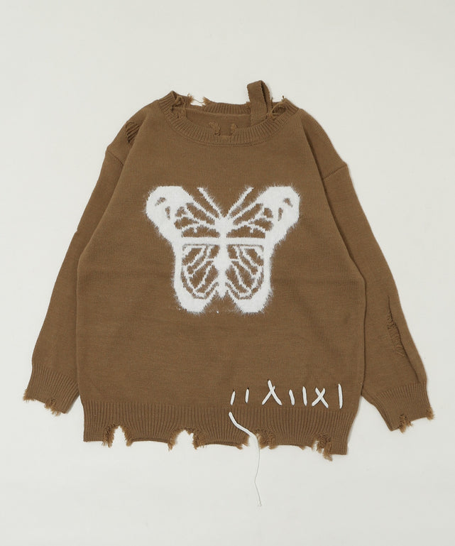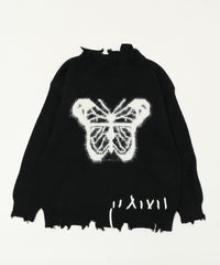 大胆なバタフライ柄とダメージ加工が融合した、存在感抜群のアートニット。