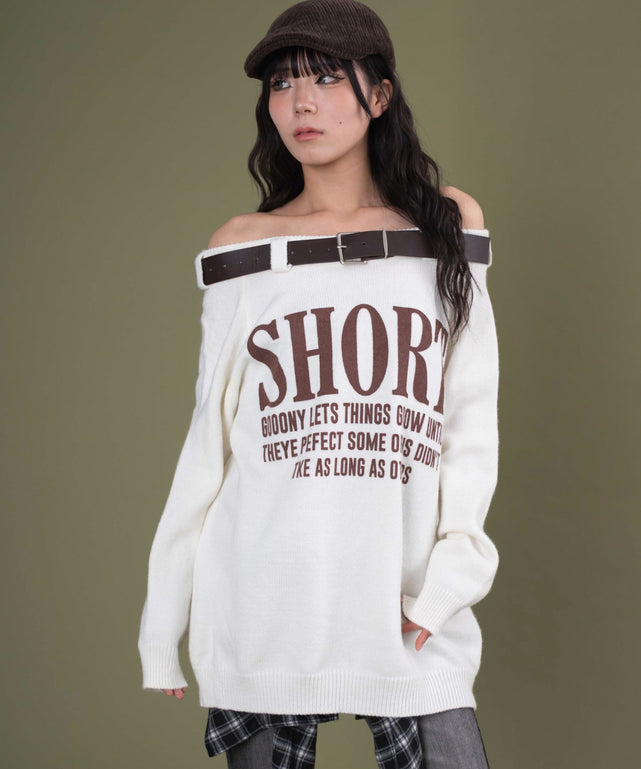 大胆なロゴプリントとワンショル風のベルトデザインが視線を惹くオフショルニット。