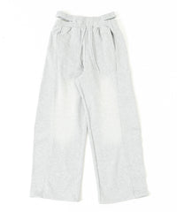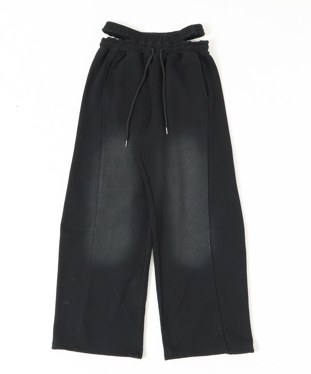 ウエスト部分のカットデザインと、脚のラインに沿ったカーブシルエットがポイントの“こなれスウェットパンツ”。