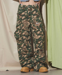 トレンド感抜群のカモフラ柄に、大胆なダメージ加工を施したストリート感満載のワイドカーゴパンツ。