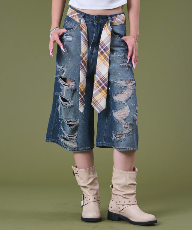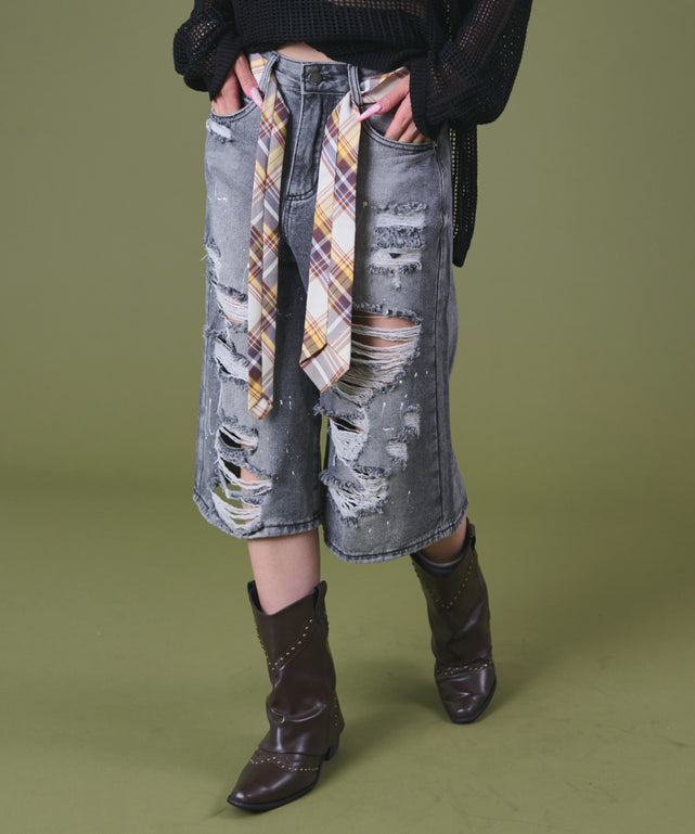 ウエストにネクタイを巻いたような、個性派ディテールが光るハーフ丈デニムパンツ。