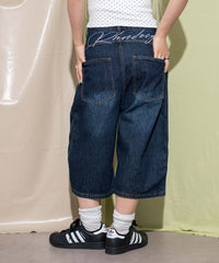 バック刺繍ロゴワイドハーフパンツ/デニム中濃 モデル:155cm M着用