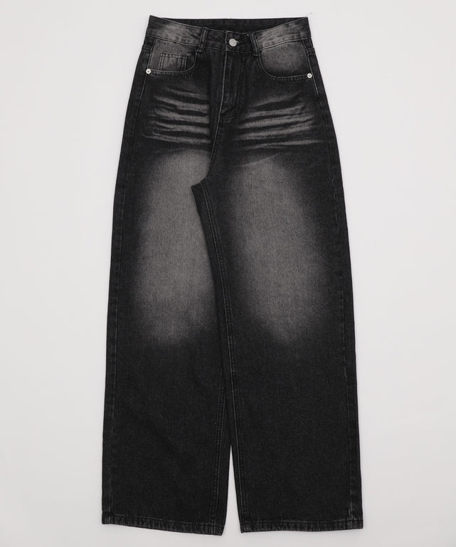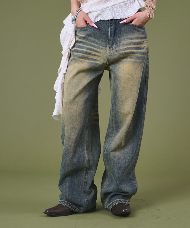 大胆なブラスト加工で立体感と味を出した、こなれ感たっぷりのバギーデニムパンツ。