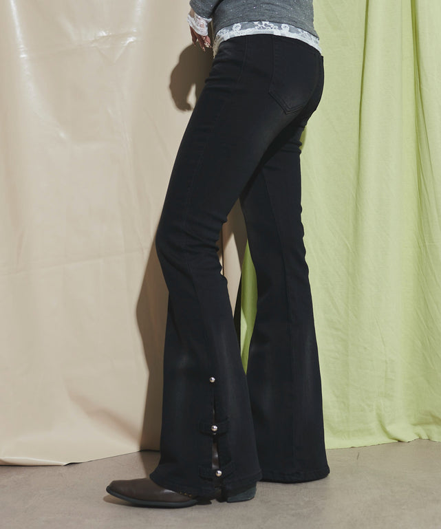 デザインスリットストレッチフレアデニム/ブラック モデル:160cm M着用