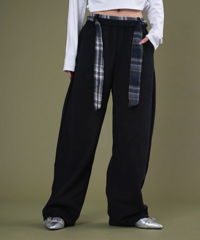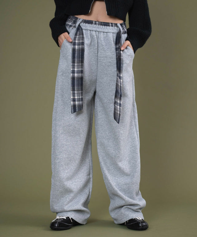 まるでチェックシャツを腰に巻いたようなフェイクデザインがポイントのスウェットパンツ。