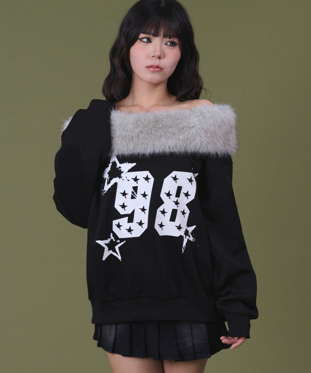 【ふわもこスターで視線独占!ファー×ロゴのオフショルプルオーバー】