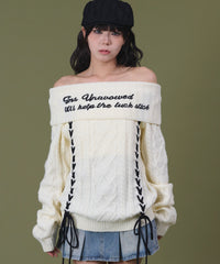 立体感のあるケーブル編みに、ロゴ入りオフショル×レースアップディテールが映えるトレンドニット。