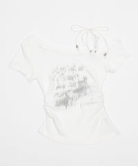 大胆なワンショルダースタイルに、退廃的なムード漂うモノトーンのグラフィックを載せた一着。