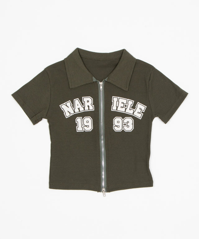 フロントに大胆なカレッジ風ナンバリングロゴを配した、襟付きの半袖リブトップス。