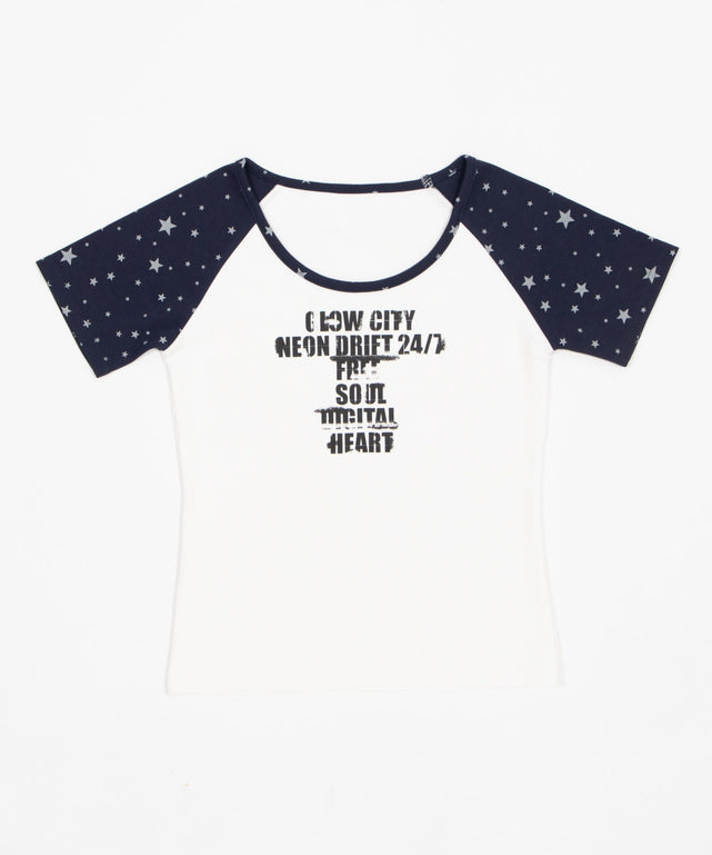 袖部分に散りばめられた無数の星柄プリントが、圧倒的な存在感を放つラグランスリーブの半袖トップス。