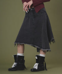 タックで立体的なシルエットをつくりながら、裾のフリンジがラフな抜け感を演出するデニムスカート。
