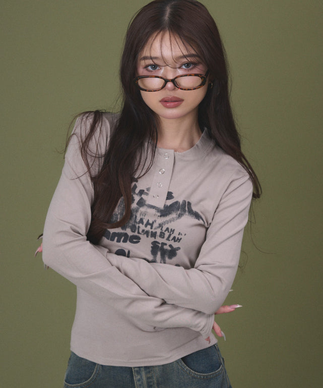 ヘンリーネックの程よい抜け感に、ストリートテイストのロゴグラフィックを大胆にのせたトレンドトップス。