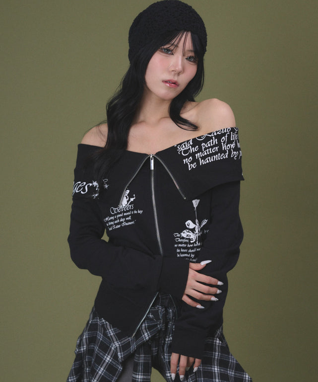 肩を落とした大胆なオフショルデザインが目を惹く、グラフィックスウェット。