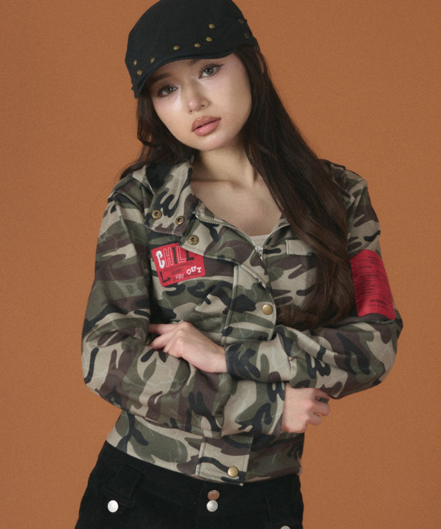 【羽織るだけで主役。ロゴが効いたフード付きカモブルゾン】
