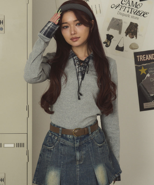 シャツカラーレイヤードトップ/グレー モデル:163cm F着用