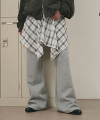 まるでチェックシャツを腰に巻いているかのようなフェイクレイヤードデザインが目を惹くフレアパンツ。
