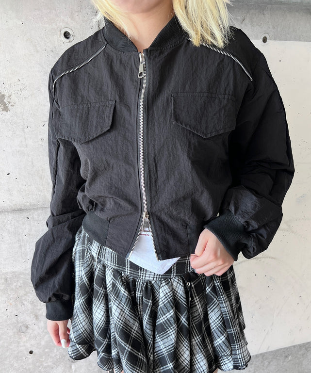 ZIPデザインクロップドボンバージャケット/ブラック モデル:160㎝ FREE着用