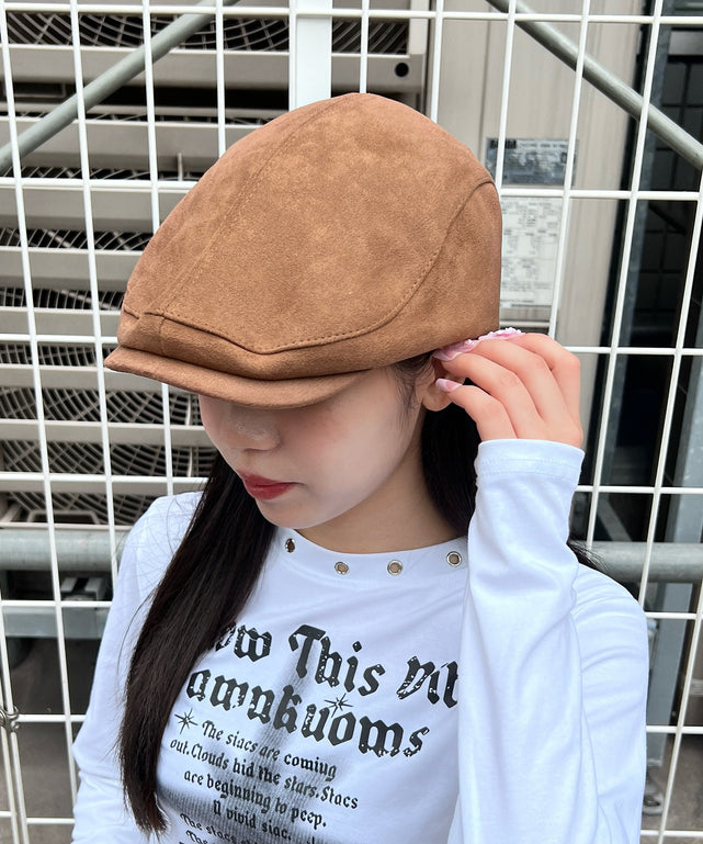 合皮起毛素材のハンチングは取り入れるだけでこなれた雰囲気に。