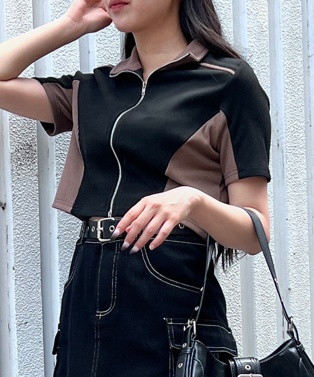 バイカラー切り替えが細見えなミニ丈トップス。