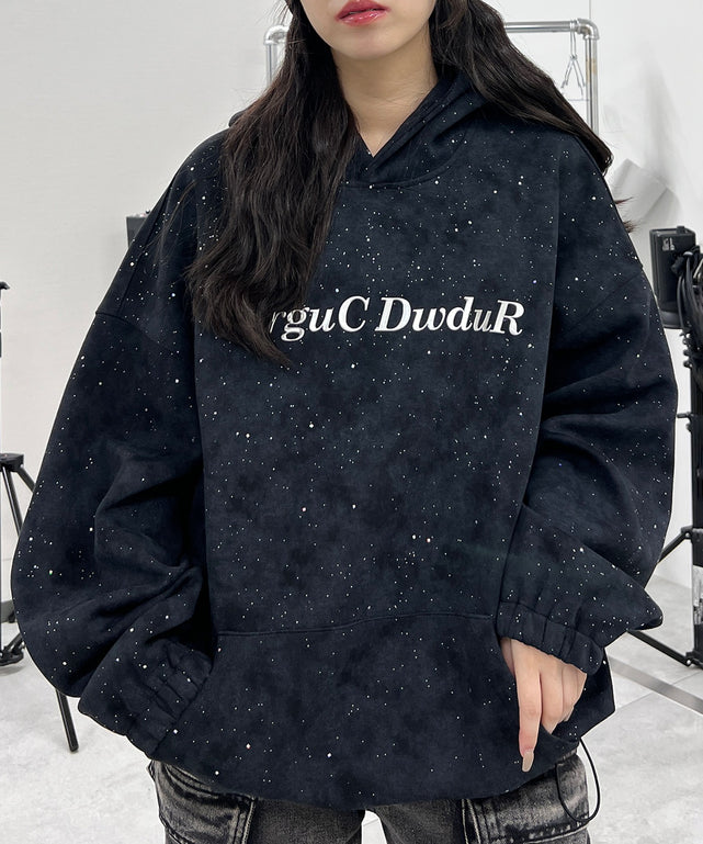 グリッター柄スウェットにメタリックな立体ロゴのついたパーカー。