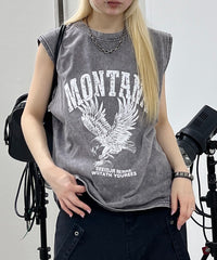 イーグルプリントが目を惹くノースリーブTシャツ。