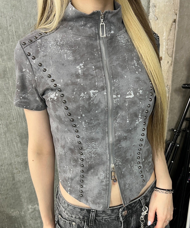 ラウンドスタッズのついたショート丈のZIPトップ。