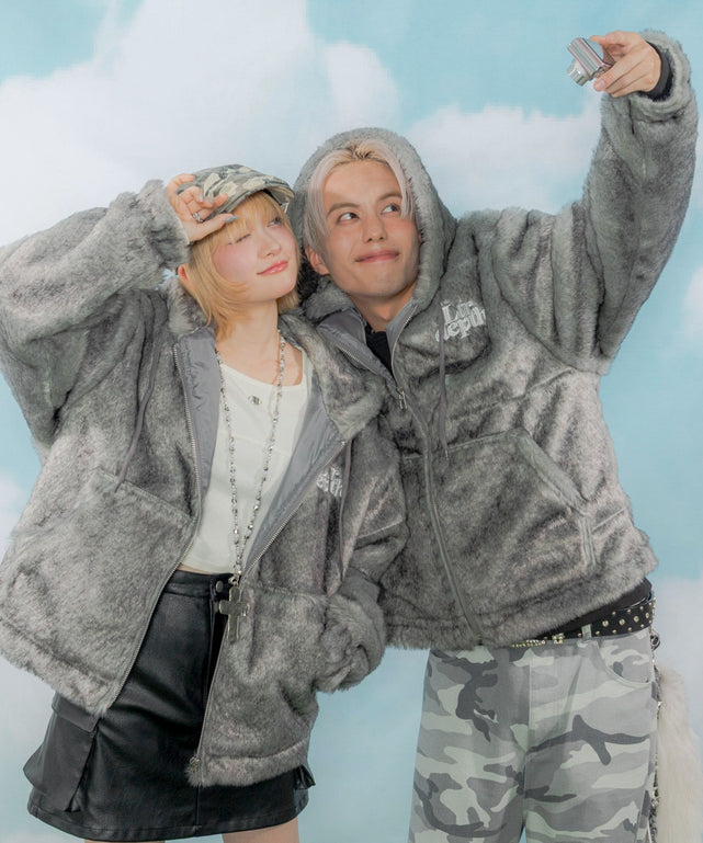 フェイクファー素材がシーズンムードを高めるファーフードロゴブルゾン。