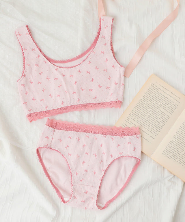 リボン×ドットの総柄デザインがオシャレなハーフトップ&ショーツセット。