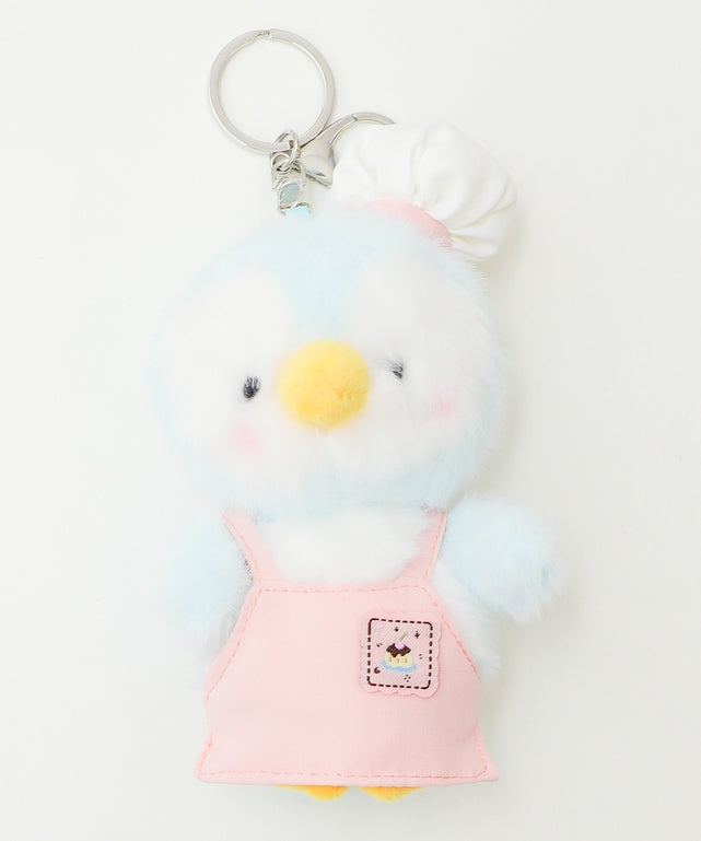 コック帽とエプロンを身につけた、ふわふわペンギンのぬいぐるみキーホルダー。