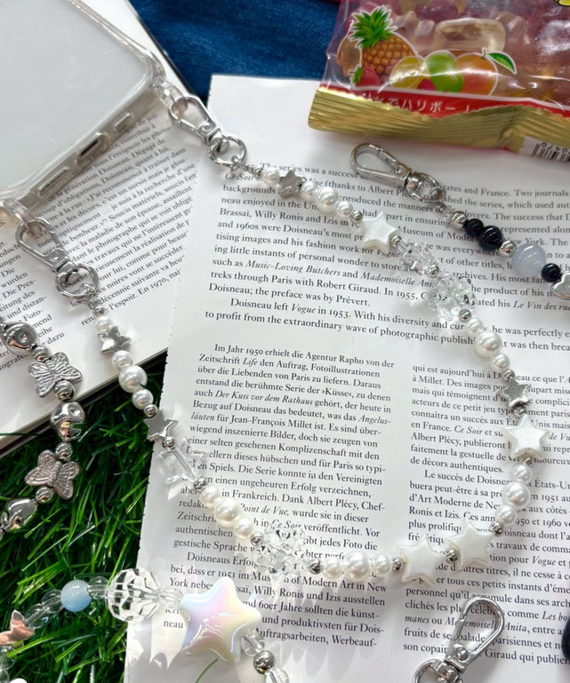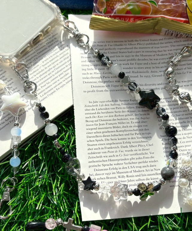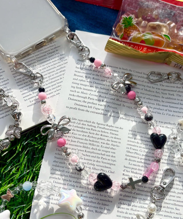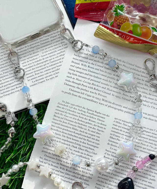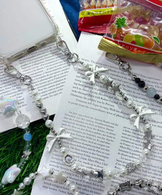 星やリボン、ハートなどのモチーフビーズを組み合わせた、アクセ感覚で使えるハンドストラップ☆