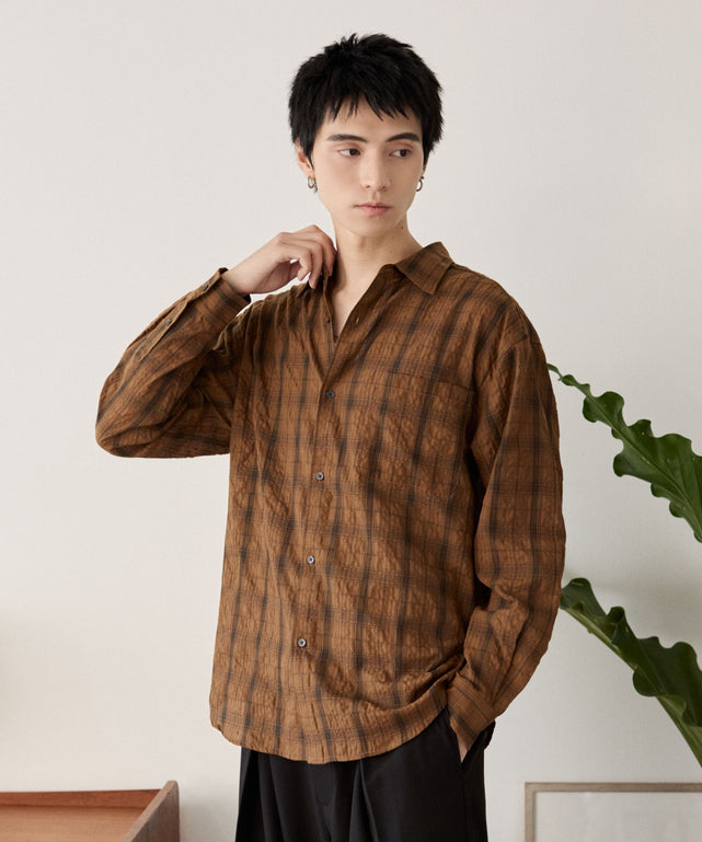 しわ加工を施したクリンクルロングスリーブチェックシャツ。