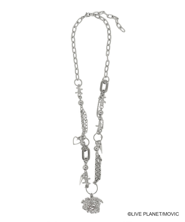 ハートや、ロゴモチーフのトップなど、パンク要素を凝縮した多重チェーンネックレス。