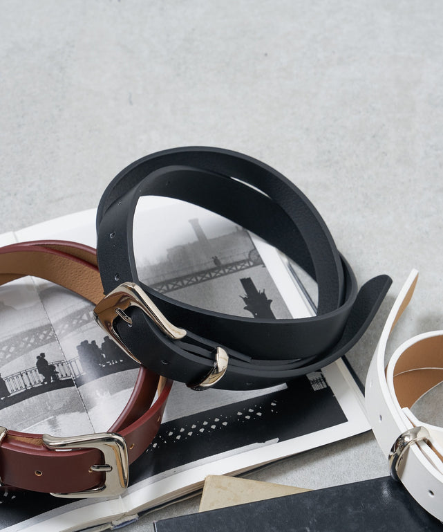 細目なフェイクレザーベルトはボトムを選ばず使える万能アイテムです。