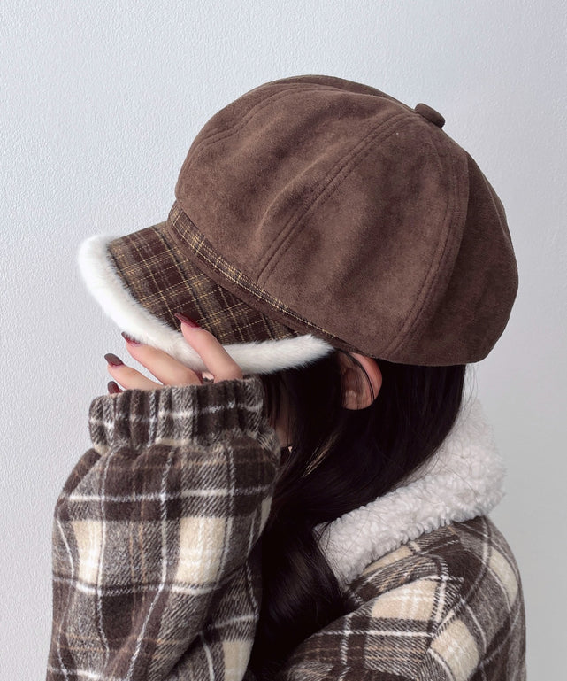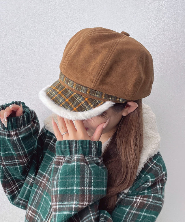 ツバの部分はチェック柄&フェイクファーデザインでこなれ感◎
