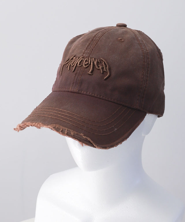 エッジの効いたダメージ加工の刺繡ロゴキャップ。