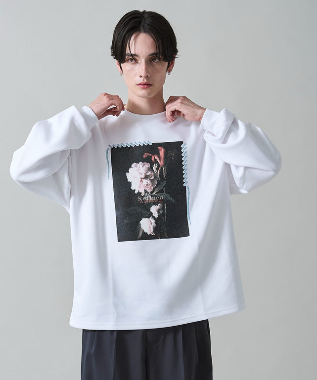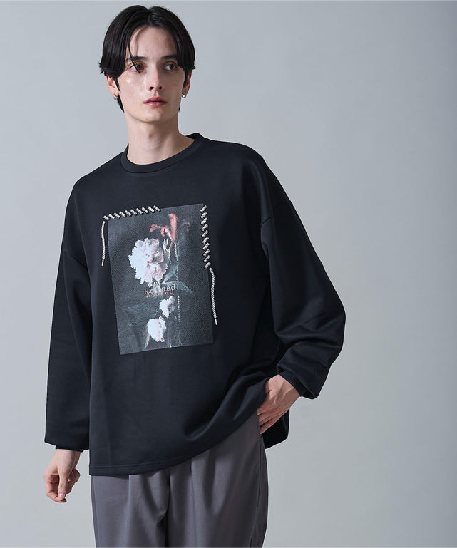 花柄のシールプリントに紐柄を発砲プリントで表現したプリントをMIXしたプルオーバー。