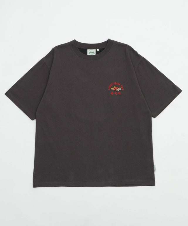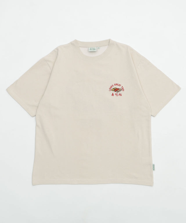 胸元にワンポイント刺繍とバックに大きく和柄とお寿司の刺繍デザインが施されています。