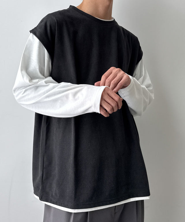 シンプルなデザインで仕上げたベストとTシャツとのレイヤード風アイテムです!