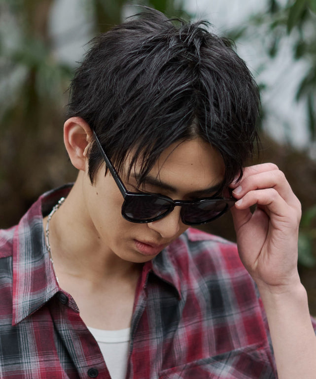 スモークレンズが程よく目元を引き締め、コーディネートにクールな印象を+。