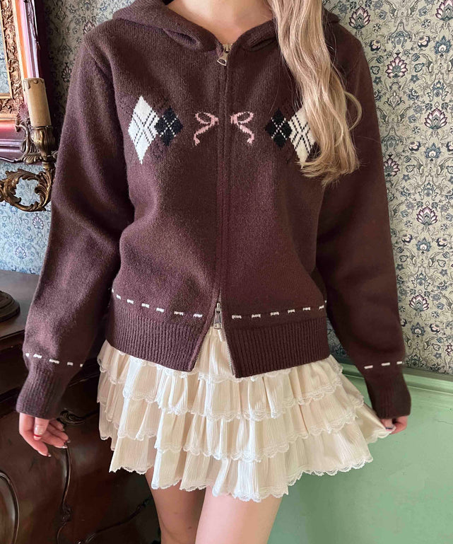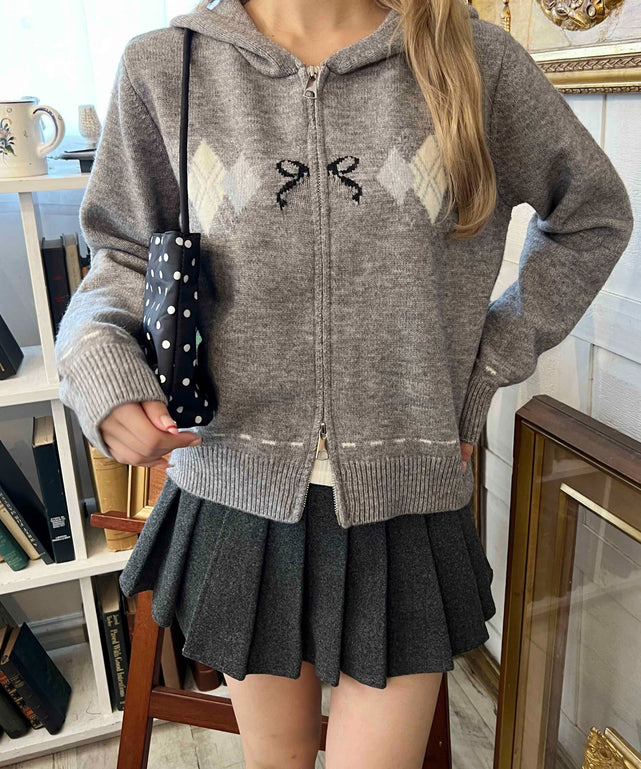 リボン×アーガイルフーディカーディガン