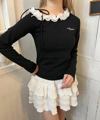 デコルテの立体フリルが、顔まわりを華やかに演出します。