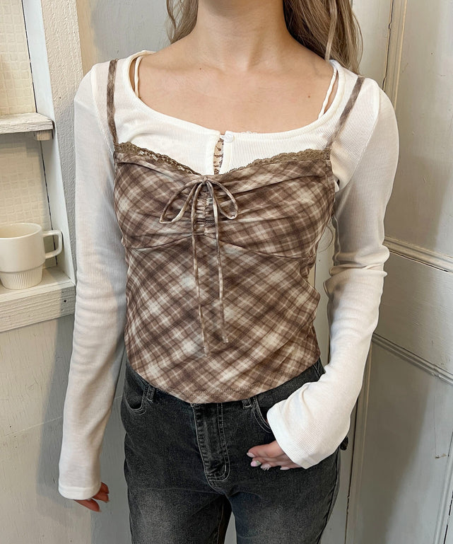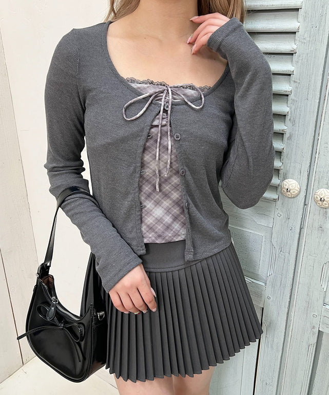 チェック柄キャミとリブトップスの、トレンド感たっぷりなセットアイテム!
