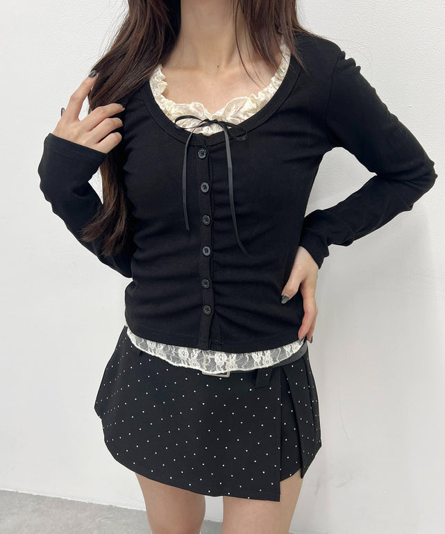 フリルレースレイヤードLSトップス/ブラック モデル:157㎝ F着用