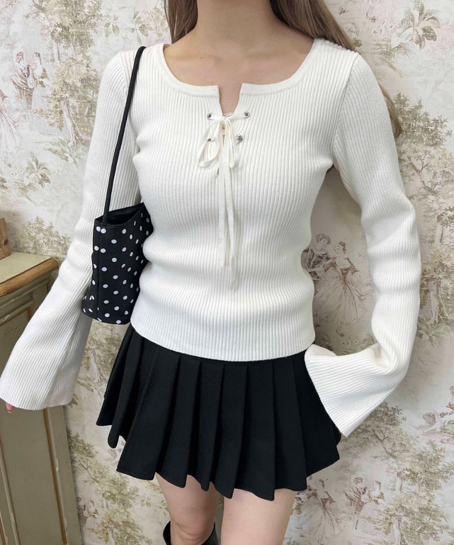 ベルスリーブレースアップニット/ホワイトアイボリー モデル:160㎝ F着用