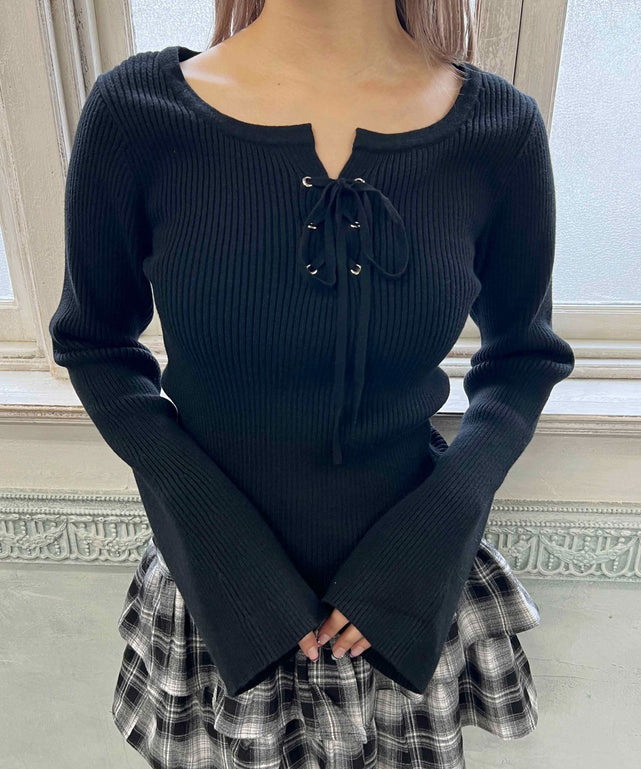 ベルスリーブレースアップニット/ブラック モデル:160㎝ F着用