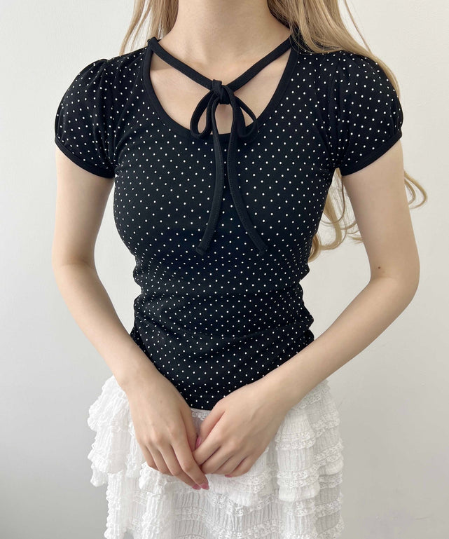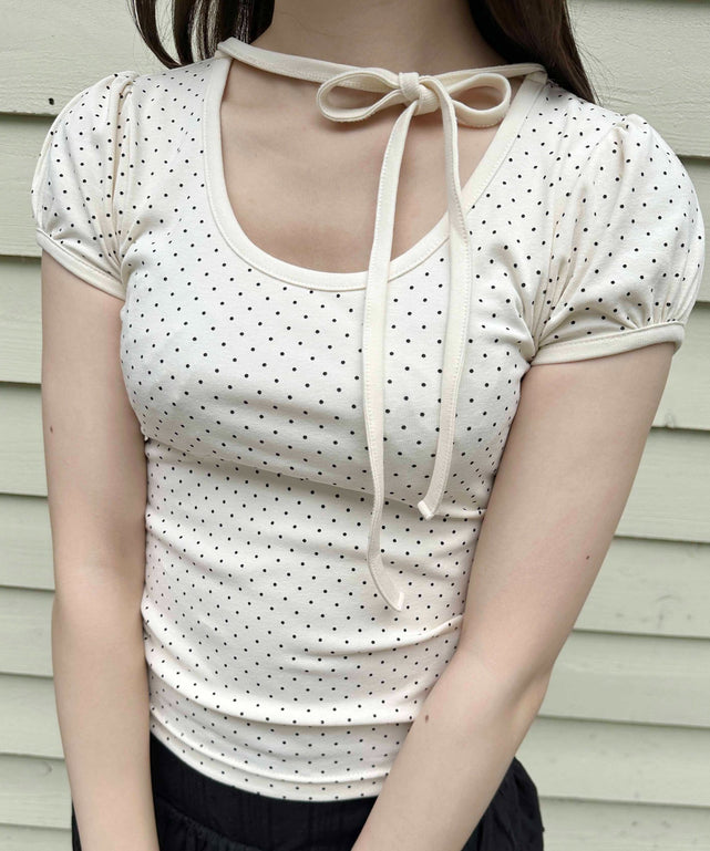 トップスに紐が付いていて、首の前で結ぶチョーカースタイルや