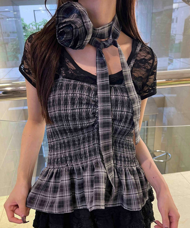 シンプルながら裾のフリルとローズのチョーカーで華やかさもプラス